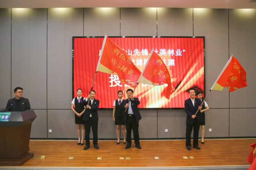 活動中,中國移動廣西有限公司、廣西定制家具產業協會、廣西三威家居新材股份有限公司、廣西綠友農生物科技股份有限公司四家企業分別代表央企、協會、民企上臺進行經驗分享。隨后,會議發布“兩山先鋒 壯美林業”產業鏈黨建聯建共建倡議書,并舉行“兩山先鋒 壯美林業”授旗儀式,為單位代表進行授旗。