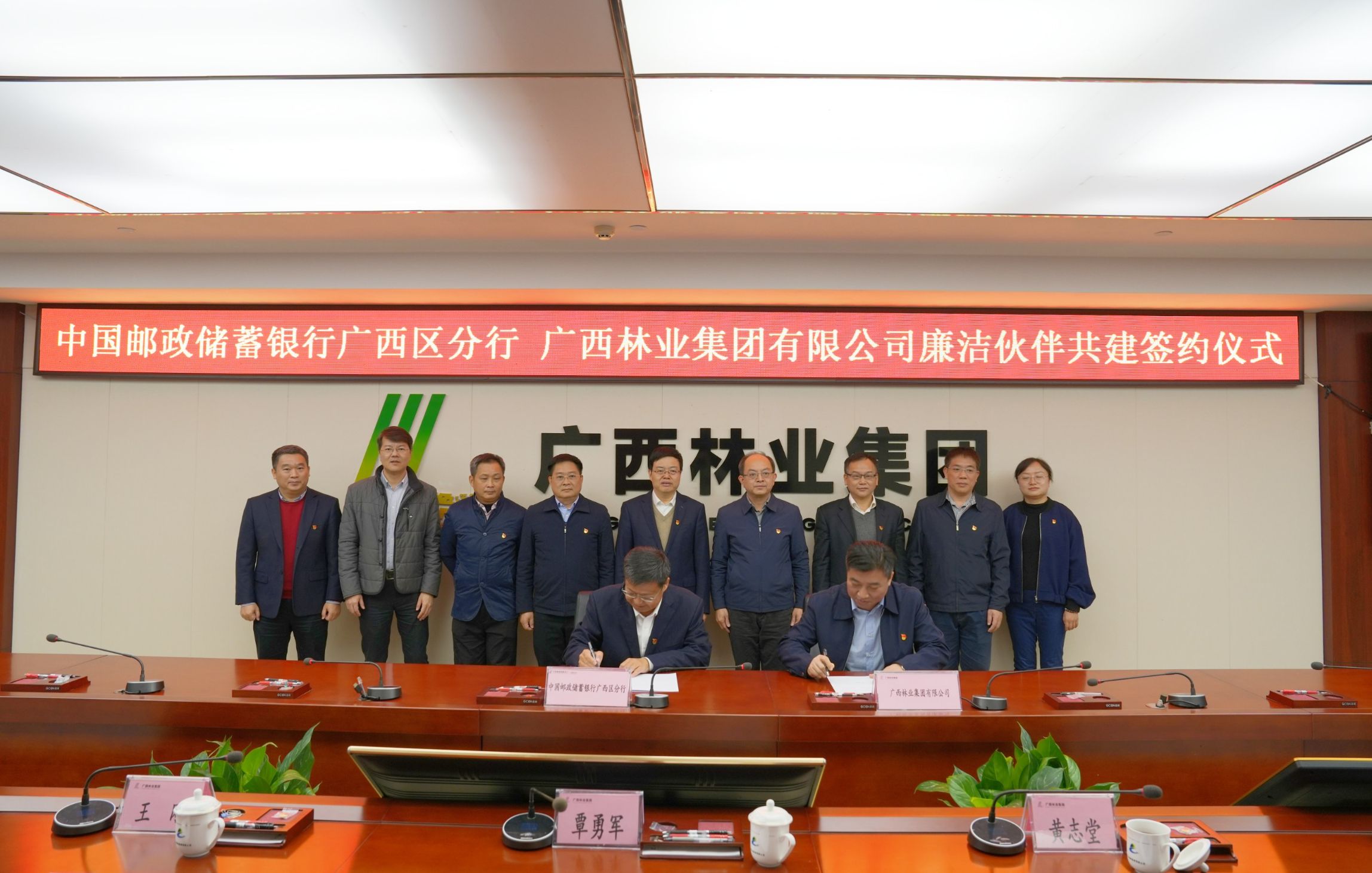 為進一步推進清廉金融文化建設,促進廉潔共建與業務發展的深度融合,12月24日,郵儲銀行廣西區分行與廣林集團舉行“廉潔伙伴共建”簽約儀式。郵儲銀行廣西區分行黨委書記、行長曾創新,廣林集團黨委副書記、董事、工會主席覃勇軍,廣林集團黨委委員、總會計師、外部董事黃志堂出席簽約儀式。郵儲銀行廣西區分行黨委委員、紀委書記李維志和自治區紀委監委駐廣林集團紀檢監察組組長,集團黨委委員、紀委書記王剛分別代表雙方簽約。
