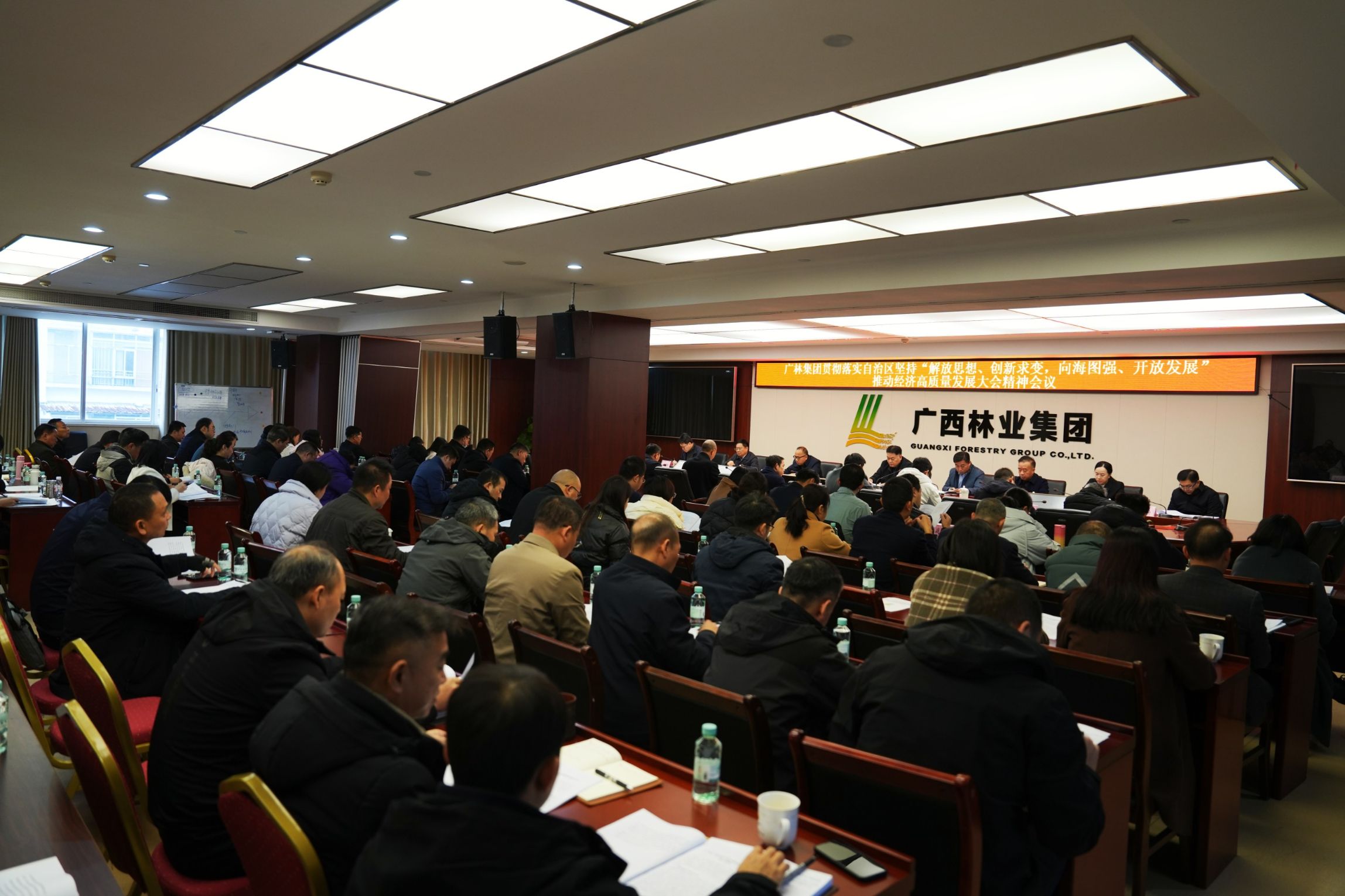 2月8日上午,廣林集團召開貫徹落實自治區堅持“解放思想、創新求變,向海圖強、開放發展”推動經濟高質量發展大會精神會議,動員集團上下按照自治區黨委、政府部署要求,以“開局即沖刺”的姿態,實干為要、創新為魂,用業績說話、讓人民評價,搶前抓早、先謀快動,奮戰“開門紅”,在新的一年邁出高質量發展的新步伐。集團黨委書記、董事長羅勇出席會議并講話,集團領導班子成員出席會議并就分管領域工作提出要求。